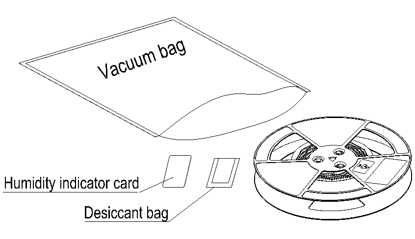 Place the packaged plastic reel, humidity indicator card and desiccant bag into a vacuum bag, and vacuumize it. |